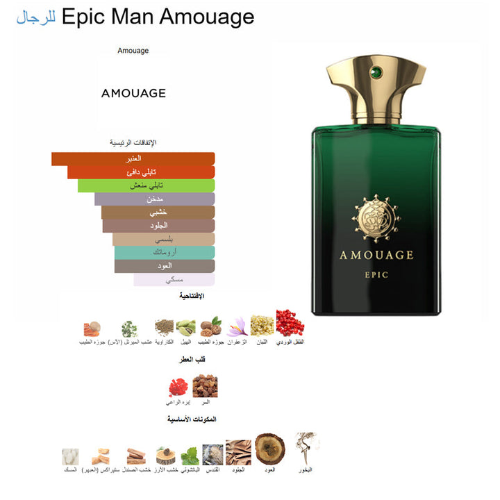 - الوصف: عطر إيبيك مان أمواج هو عطر شرقي - خشبي للرجال، يجمع بين النفحات الفاخرة والغنية في تركيبة أنيقة وجذابة. يبدأ العطر بنفحات منعشة من الفلفل الوردي، اللبان، الزعفران، جوزه الطيب، الهيل، الكاراوية، عشب الميرتل (الآس)، وجوزه الطيب، التي تمنحك إحساسًا بالحيوية والانتعاش. ينتقل العطر بعد ذلك إلى قلب عطري مكثف، حيث تبرز روائح المر وإبره الراعي، لتضفي لمسة من العمق والغموض. أخيرًا، تستقر التركيبة على قاعدة دافئة وغنية، تجمع بين البخور، العود، الجلود، القندس، الباتشولي، خشب الأرز، خشب الصندل، ستيراكس (العبهر)، والمسك، لتخلق إحساسًا دافئًا ومميزًا يدوم طويلاً.