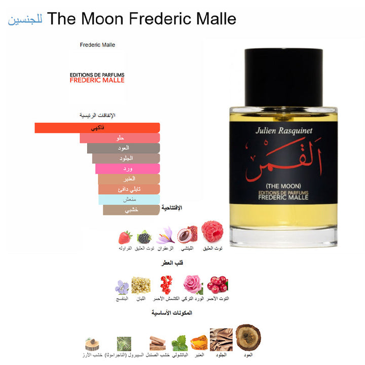 • الوصف: عطر القمر من فريدريك مال هو عطر شرقي - زهري للجنسين، يجمع بين النفحات الفاخرة والغنية في تركيبة فريدة ومميزة. يبدأ العطر بنفحات منعشة من توت العليق، الليتشي، الزعفران، توت العليق، والفراولة، التي تمنحك إحساسًا بالحيوية والأناقة. ينتقل العطر بعد ذلك إلى قلب عطري مكثف، حيث تبرز روائح التوت الأحمر، الورد التركي، الكشمش الأحمر، اللبان، والبنفسج، لتضفي لمسة من الأناقة والعمق. أخيرًا، تستقر التركيبة على قاعدة دافئة وغنية، تجمع بين العود، الجلود، العنبر، الباتشولي، خشب الصندل، السيبرول (الناجراموثا)، وخشب الأرز، لتخلق إحساسًا دافئًا ومميزًا يدوم طويلاً.