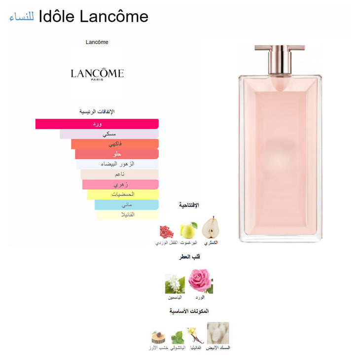 - الوصف: عطر ايدول لانكوم هو عطر تشيبر - زهري للنساء، يجمع بين النفحات الفاخرة والغنية في تركيبة فريدة ومميزة. يبدأ العطر بنفحات منعشة من الكمثري، البرغموت، والفلفل الوردي، التي تمنحك إحساسًا بالحيوية والأناقة. ينتقل العطر بعد ذلك إلى قلب عطري مكثف، حيث تبرز روائح الورد والياسمين، لتضفي لمسة من الأنوثة والعمق. أخيرًا، تستقر التركيبة على قاعدة دافئة وغنية، تجمع بين المسك الأبيض، الفانيليا، الباتشولي، وخشب الأرز، لتخلق إحساسًا دافئًا ومميزًا يدوم طويلاً.