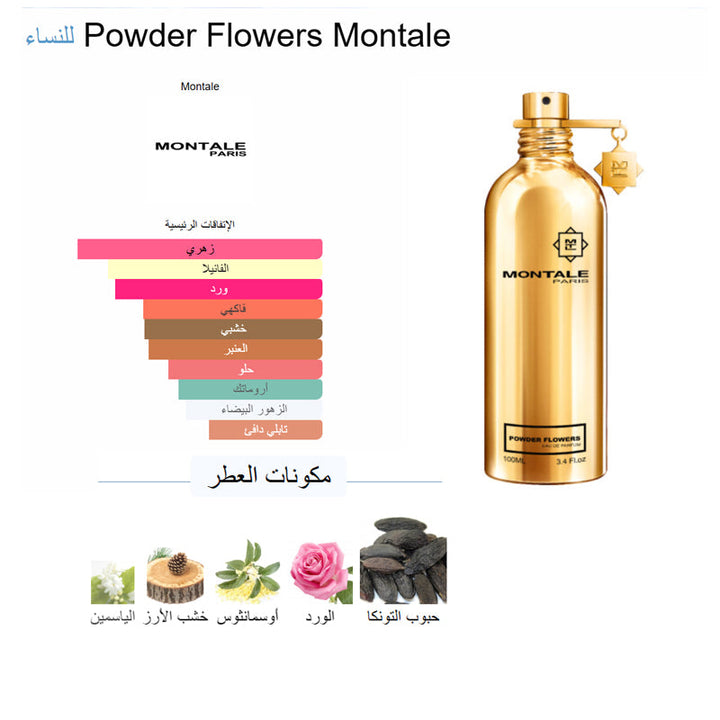- الوصف: عطر باودر فلاورز مونتال هو عطر زهري للنساء، يجمع بين النفحات الفاخرة والغنية في تركيبة فريدة ومميزة. يبدأ العطر بنفحات ناعمة من حبوب التونكا، التي تمنحك إحساسًا بالدفء والأناقة. ينتقل العطر بعد ذلك إلى قلب عطري مكثف، حيث تبرز روائح الورد، أوسمانثوس، خشب الأرز، والياسمين، لتضفي لمسة من الأنوثة والعمق. أخيرًا، تستقر التركيبة على قاعدة دافئة وغنية، لتخلق إحساسًا دافئًا ومميزًا يدوم طويلاً.