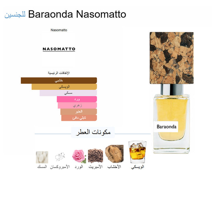 • الوصف: عطر باراوندا ناسوماتو هو عطر شرقي - خشبي للجنسين، يجمع بين النفحات الفاخرة والغنية في تركيبة فريدة ومميزة. يبدأ العطر بنفحات جريئة من الويسكي، التي تمنحك إحساسًا بالدفء والغموض. ينتقل العطر بعد ذلك إلى قلب عطري مكثف، حيث تبرز روائح الأخشاب، الأمبريت، والورد، لتضفي لمسة من الأناقة والعمق. أخيرًا، تستقر التركيبة على قاعدة دافئة وغنية، تجمع بين الأمبروكسان والمسك، لتخلق إحساسًا دافئًا ومميزًا يدوم طويلاً.